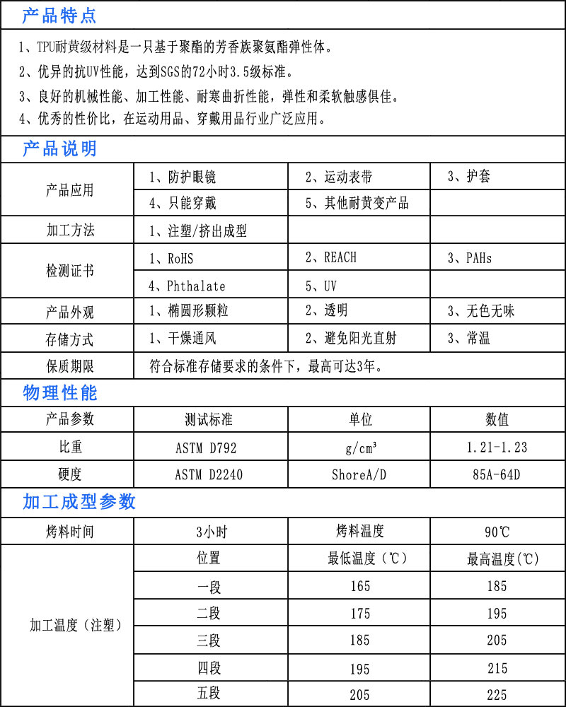 TPU制品黄变是业界一个公认的难题,特别是一些颜色鲜艳的TPU制品,例如白色、粉红等颜色。各种类型的TPU中,尤其是芳香族TPU的黄变为最厉害。黄变主要是由于紫外线对TPU材料持续照射而产生的颜色变黄现象,其中芳香族TPU中的苯环遇紫外线黄变是一种正常的反应。国际通用黄变测试以24小时为一个周期,每个周期分1-5级判断颜色变化,5级为无变化。大多聚酯型TPU的正常黄变级别在24小时2-3级,抗UV专用TPU材料在无需外在添加任何抗黄变剂的情况下,测试能达到72小时的3-4级。这也为解决TPU制品黄变的难题带来了一个便利的解决方案,成为表带、护套、运动用品等行业不二选择。本材料有成型快、机械性能优异、优秀的抗黄变性能和老化性能,是一只性价比很高的材料。